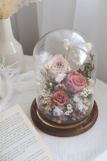 Flowers in Dome: Preserved Premium Garden Roses, Preserved Rose, Preserved Hydrangea, Preserved & Dried foliage and filler flower.